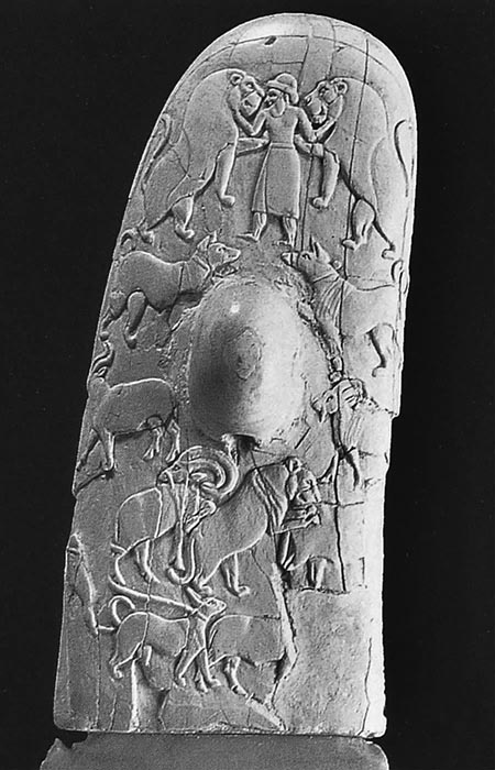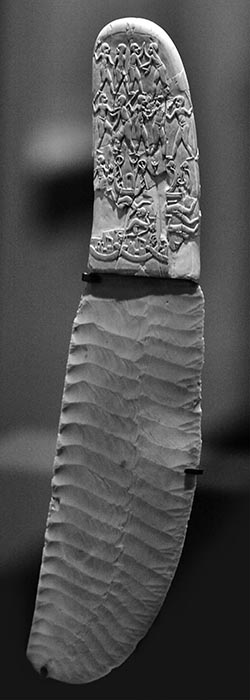 这件武器是在埃及阿拉克山( Gebel el-Arak )发现的,时间为前王朝时代后期。象牙刀柄两面的雕刻如图所示,表明出明显的美索不达米亚文化的影响。左图,刀柄上倒下的尸体与船只混合在一起,这些船只的式样与美索不达米亚印章上所雕刻的很相似;而在柄的后部末端,一场相当壮观的战斗正在进行。苏美尔的航海者在进入红海沿岸时也许经常同当地居民发生这样的混战。柄的另一面再现了美索不达米亚的主题:一个大胡子男人的两侧各站着一头直立的狮子,这样的画面在美索不达米亚艺术中很常见,类似的主题也见于浮雕下方,一只狮子正在向它的猎物背上扑过去。浮雕给人总的印象是在模仿美索不达米亚的高级艺术,虽然巧妙,但依然原始且具有地方性。