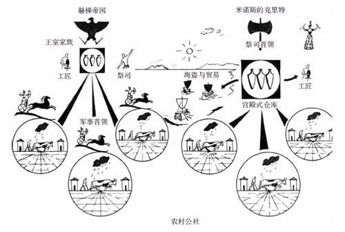 在早期米诺斯文字被破译之前,对克里特社会的结构只能作一些推测。克里特王宫的防御设施并不糟糕,迷宫似的宫殿围绕一座礼堂而建成,富丽奢华,大概是用于宗教仪式,这说明主宰克里特政治生活的是祭司而不是军事首领。也许,克诺索斯统治者的财富和权力依赖对外贸易和宗教特权的程度胜过依赖地租和强制性劳役。如果这些统治者控制着定期往返于克里特、埃及、利凡特(