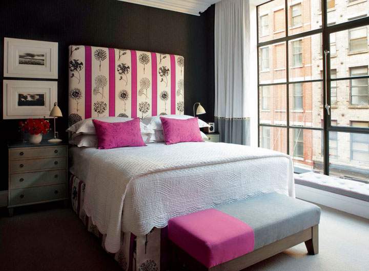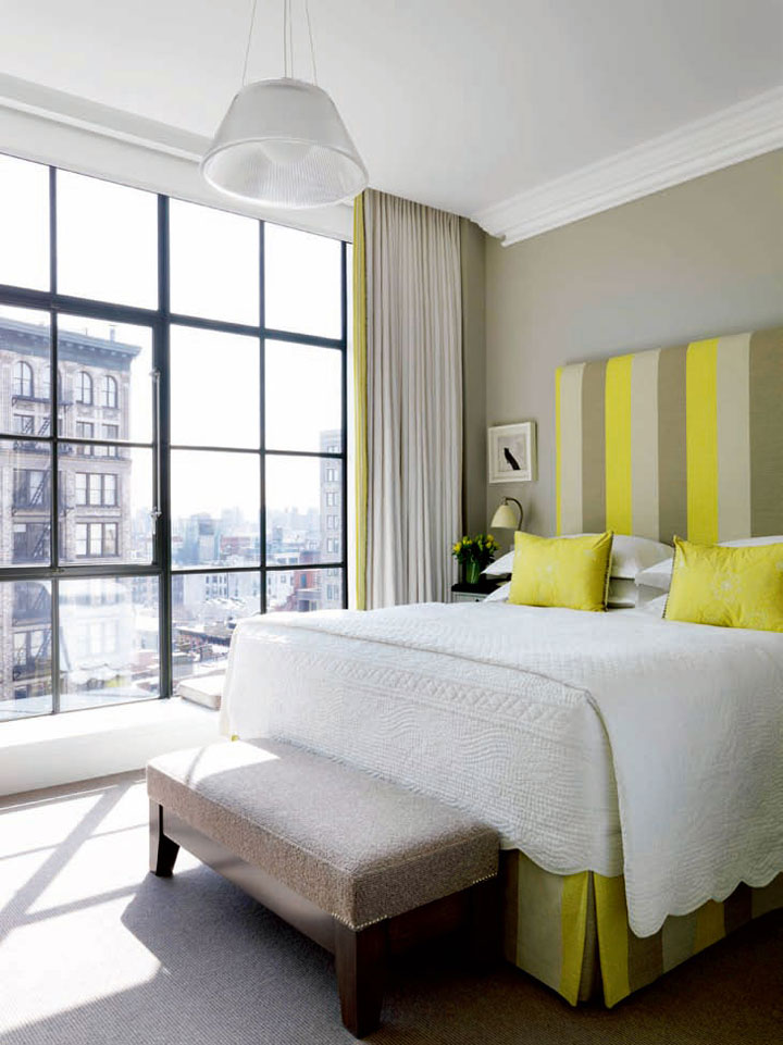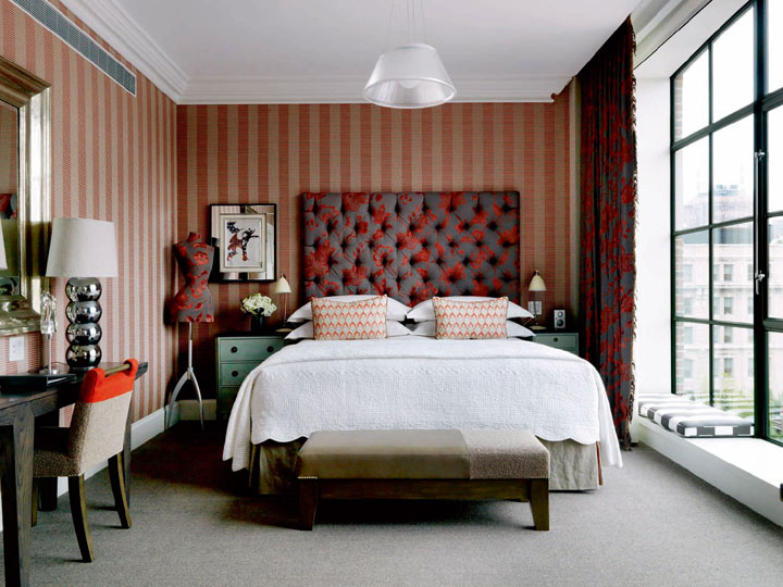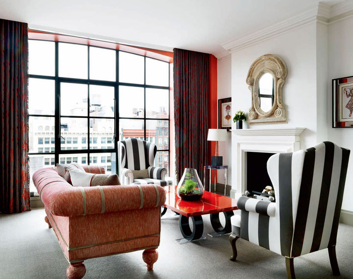 并非一定要靠镜面才能够营造出大空间的效果,在酒店中随处可见几何符号的变换,随处可见对比色彩的运用,还有那些并不太吸引人眼球的粗糙材质的点缀。设计师在设计拥挤的小空间时经常遇到各种棘手的问题,并非全然无能为力,也并非只有惯常作风。简洁流畅的黑白色线条与红紫色的线形布纹谁比谁更抢眼呢?还有很多不规则的图形和日常生活中无法想象到的颜色,其实设计师需要的就是多一些大胆,多一些尝试。克罗斯比街酒店的每一个细节并非都是经典,但肯定有一个让你觉得很可爱。这就是设计!