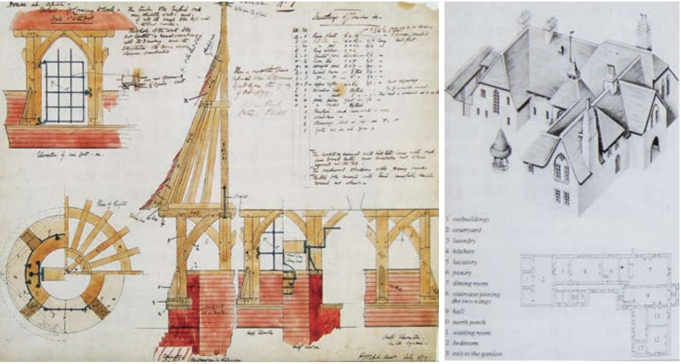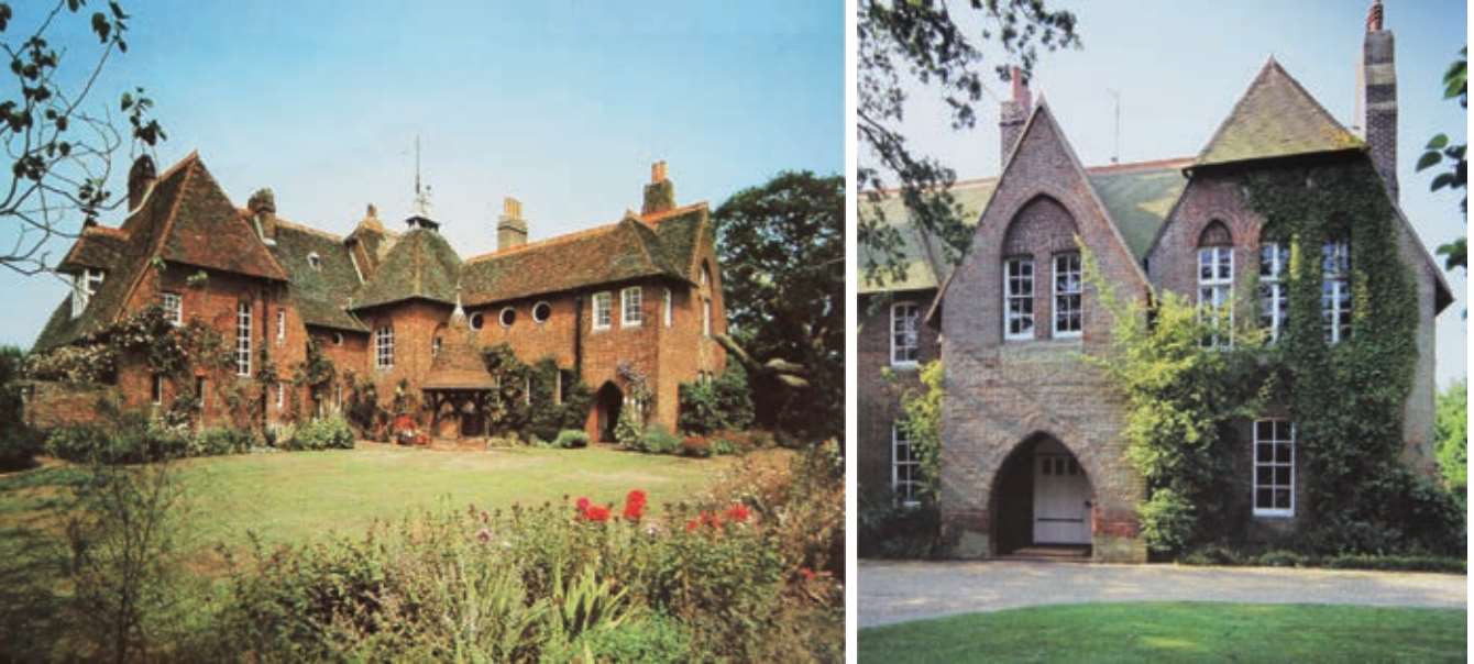 这场激进的、富有变革色彩的艺术与设计运动催生了很多20世纪建筑、设计界的中流砥柱人物,诸如韦伯、沃赛、斯科特(M.H. Baillie Scott,1865—1945)、诺曼·肖(Richard Norman Shaw,1831—1912)以及麦金托什(Charles Rennie Mackintosh,新艺术运动成员)等人,通过参与这场运动,他们基本上都形成了自己的设计思想和设计理念,包括:设计应遵循功能;建筑的地域性风格以及地域性材料应当受到尊重;建筑物应同周围的景观和谐统一;借鉴历史风格等观点。后来,他们设计的许多建筑物——特别是为中产阶级设计的住宅(图2-11)——被建筑史学家尼古拉·帕夫斯纳(Nikolans Pevsner)评价为“比同时代的任何东西都更清新、更具审美刺激性”。