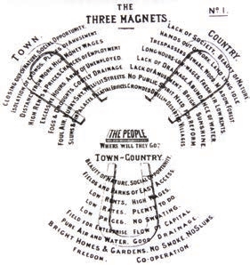 工艺美术运动在建筑设计上的原则以及莫里斯带有空想社会主义性质的设计改革理想,也促进了英国20世纪初期“田园城市运动”的产生。“田园城市运动”(The Garden City Movement)建立在埃比尼泽·霍华德(Ebenzer Howard,1850—1978)(图2-12)的城市规划理论之上。这些理论集中体现在他于1898年撰写的一部具有影响力的著作:《明天——走向社会改革的和平之路》(Tomorrow:a Peaceful Path to Real Reform,1902年重新修订并更名为《明日之田园城市》)一书中。霍华德的“田园城市”不仅是一种城市规划思想,更是一种社会改革方案。19世纪末英国工业革命在深入发展的同时,也带动了城市化的发展,人口以及优质资源大量向城市集中,一方面造成了巨大的城乡差别,另一方面也拉大了城市的贫富差距。为了改变这一状况,霍华德倡导通过在全国范围内建立小型的、自给自足的城市来抑制大都市的扩张和人口膨胀,以缓解城市压力。他用一个“三磁铁图”(图2-13),形象地阐释了“田园城市”的思想,即通过“城市—乡村”一体化这种新的社会形态,把乡村的优点和城市的优点结合起来,同时把二者的缺点摒除掉,最终创造一种完美的生活环境和生活方式。随后,许多小的田园城市被不断建立起来,并取得了不同程度的成功。原先遍及全国的普通住宅成为建筑师革新的焦点,这带动了国内建筑行业的狂热复兴,特别是“红屋”这一工艺美术运动式样的建筑风格尤为流行。这股设计热潮从英国开始向欧洲其他地区蔓延,并通过德国建筑师赫尔曼·穆特修斯(Herman Muthesius,1861—1927,德国制造同盟成员)设计的“英式住宅”(The English House,1904—1905),以及二十人小组
