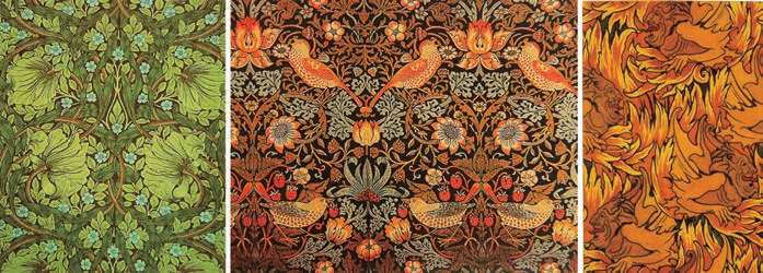 参与这项工程的成员很快领导了当时建筑、家具、室内装饰以及日用品和平面设计(图2-9)等领域的潮流。1861年莫里斯、韦伯、罗塞蒂和伯恩·琼斯、福特·布朗(Ford Madox Brown,1821—1893)以及检查员P. P.马绍尔(P. P. Marshall)和会计师查尔斯·福克纳(Charres Faulkner)等人一起建立了莫里斯、马绍尔、福克纳制造和装饰公司。1864年莫里斯将其他人的股份买下来,创建了独立的“莫里斯设计事务所”(又称莫里斯商行:Morris & Co)。事务所一律采用手工艺的方式来设计和生产包括家具、挂毯、彩色玻璃、室内织物、地毯、瓷砖和墙纸等在内的一切家居产品(图2-10)。莫里斯的目标是致力于创造美的、实用的、人人都能负担得起的、有艺术性的物品,以使所有的人都能享受艺术为生活带来的愉悦。正如他本人所宣称的:“我不想要只为少数人服务的艺术,也不想要只能为少数人享有的教育和自由。”所以,莫里斯要求所有的手工业人员必须全程参与产品的设计和制造过程,以便为社会提供既不同于维多利亚风格又有别于工业化风格的优美设计。
