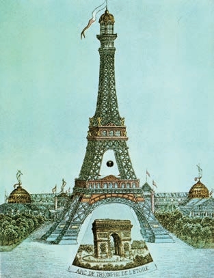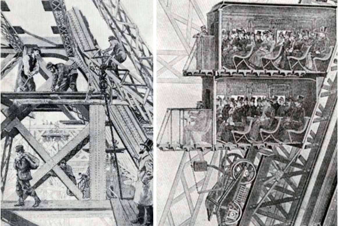 与机械展览馆同时建造的另一个划时代建筑是埃菲尔铁塔。埃菲尔铁塔是世界上第一座钢铁结构的铁塔,塔基占地约1万平方米,高300米(图1-67)。四座塔墩由水泥浇灌,塔身为镂空的钢架结构。在建造方式上与“水晶宫”一样也是采用预制构件的方法,在工厂加工完毕后运至现场进行组装。300名组装工人在近两年的时间里用了250万个铆钉,把重7000吨的1.8万个结构部件安装成高塔(图1-68)。建成之后这座以建筑师埃菲尔命名的铁塔受到了市民和一些评论家的强烈批判,讥讽它为“怪物”,破坏了巴黎的景致,要求拆除。幸而当时无线电刚刚发明,因塔身高而被用作无线电发射塔,才免于被拆除的命运。现在,埃菲尔铁塔已经成为巴黎乃至法国的象征。