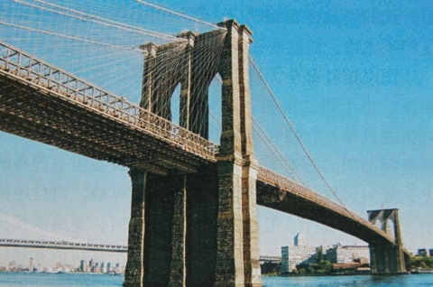 以钢铁为基础的结构表现主义风格首先是从建造桥梁开始的。1777—1779年由托马斯·特尔福德(Thomas Telford)设计的位于英国什罗普郡横跨煤溪谷(Coalbrookdale)赛文河上的乔治铁桥(Iron bridge Gorge)是英国工业革命后建造的第一座铁桥,也是工业革命开始的象征。这座桥全长60米,宽7米,跨度为30.5米,距离河面13.7米,由5个半圆形的拱肋支撑。在形体上是模仿传统的石拱桥形状,拱肋是分开的,并用放射状的铁件连接(图1-52)。与传统的石质桥梁相比不仅结构轻盈、坚固耐用,而且能轻松跨越极大的宽度。乔治铁桥开创了世界钢铁桥梁的先例,标志着西方用木、石等天然材料建造桥梁时代的结束。在它之后,伴随着冶炼技术的提升以及建造技术的进步,一座座用钢铁材料建设的大桥被迅速建造起来。它们不但结构越来越合理,重量越来越轻,而且跨度也越来越大。到18世纪晚期铁桥的跨度已经可以达到几百米。如1883年落成的由约翰·罗布林父子(John Roebling;Washington Roebling)设计的纽约布鲁克林大桥,采用缆索结构使主桥面的跨度达到486米。由于它的跨度之长(横跨布鲁克林与曼哈顿)、距水面之高(90米)设计方案一经公布就被指责为“疯狂的梦呓”,而落成之后则成了世界奇观(图1-53)。这座桥梁虽然是19世纪钢铁桥梁之最,代表着当时最高的结构表现主义建造技术,但从它的形态上看仍不难发现一种折中主义的倾向。这是为了迎合大多数人的心理需求,而被迫采取的一种让步。这种让步就体现在布鲁克林大桥主桥墩的设计上。布鲁克林大桥设计建造的时候正处在美国折中主义风格盛行的年代。桥梁主体虽然采用了新技术、新材料,但人们依旧希望能在局部看到古典主义的遗韵。所以,桥墩就被设计成了有两个门洞的哥特式拱门。远远望去,这个拱门就像巨大的古罗马凯旋门,布鲁克林大桥也因此获得了“美国凯旋门”的美称。