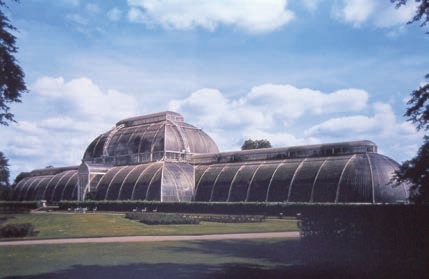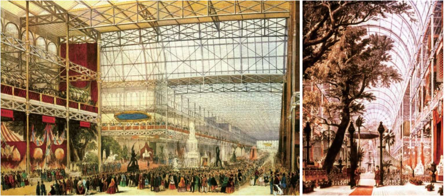 19世纪最伟大的结构表现主义设计是“博览会”建筑。1851年英国为了颂扬维多利亚时代的伟大以及向世界炫耀工业革命的成果,决定举办一次博览会来展示他们在艺术和工业方面的成就。这次展览会由维多利亚女王的丈夫阿尔伯特亲王亲自负责组织。地点选在海德公园。为了举办好第一次世界性展览会,组委会向各国建筑师征集展览会场馆的设计方案。参选的245个方案,不是过于复杂、造价过于昂贵,就是周期过长,或不切实际。为了能够以最快的速度建成并适合展览,阿尔伯特亲王听从了园艺师约瑟夫·帕克斯顿(Joseph Paxton)的建议,建造了由钢铁和玻璃组成的温室花房式建筑。温室建筑在英国发展得比较成熟,18世纪以来随着欧洲海外殖民的扩展,在大量财富源源不断地流入欧洲的同时,世界各地的珍卉嘉木也随之进入欧洲。为了让来自亚洲、美洲以及非洲等地的热带或亚热带植物在寒冷的欧洲生存下来,建筑师和园艺师利用钢铁和玻璃建造了一种前所未有的新型建筑——玻璃温室(图1-59)。阿尔伯特亲王采纳了帕克斯顿的建议,并委托他负责展览馆的设计,场馆仅用九个月就完成了。这个占地7.4万平方米、长563米