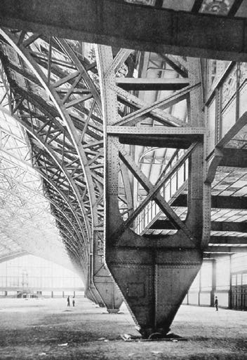 19世纪后期,最具有划时代意义的结构表现主义设计也是诞生于博览会中。法国资产阶级革命胜利后,现代工业和科学技术快速发展。1889年为迎接国际博览会在巴黎举行以及纪念法国大革命100周年,同时为了向英国的工业和贸易地位发出挑战,法国政府决定建造一系列能够影响历史的建筑物。巴黎世博会的机械馆和埃菲尔铁塔就是其中的两个。1889年,由工程师V.康泰明(V. Contamin)和C.L.F.杜特尔特(C.L.F. Dutert)负责博览会的机械展览馆的设计(图1-65)。这座展览馆长420米,宽115米,高度达45米。在设计中首次采用了三铰拱的原理,利用钢铁的抗压性能,将120吨的拱顶压力集中在逐渐变细的铁架支点末端(图1-66),充分展示了力与美的建构,彻底颠覆了人们传统的金字塔式的审美习惯,从此开创了一种新的结构形式。可惜它的命运与“水晶宫”一样,博览会结束后随即被拆除。