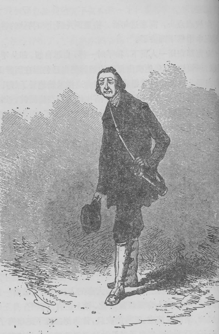这人身材高大,又干又瘦,大约四十来岁,活像个大头钉,可不是吗,他的头又大又宽,高高的额角,长长的鼻子,大大的嘴,翘得很高的下巴。眼睛呢,戴着大而圆的眼镜,闪烁不定的眼光像是有夜视症。看样子他是个聪明而愉快的人。世界上有那么一种庄重的人物,不苟言笑,用严肃的面具掩盖着他们的卑鄙,这位生客却不像那种人那样使人望而生畏。而且他那种随随便便的样子、潇洒可爱的态度,都显得他是一位好好先生,对人对事都懂得看其好的一面。他还没有开口,人家就感到他很喜欢说话。尤其是看他那种视而不见、听而不闻的神气,就知道他是个粗心大意的人。他头上戴着一顶鸭舌帽,脚上穿着粗黄皮靴,靴上还有皮罩子,身上是栗色绒裤,栗色绒茄克,无数的衣袋,仿佛都塞满了记事簿子、备忘册子、手折子、皮夹子以及杂七杂八的没用的东西。腰间还斜挂着一个大望远镜。