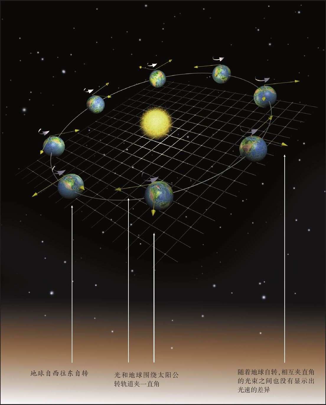 图1.2 在地球公转方向和与它相垂直的方向的光速之间找不到任何差别。