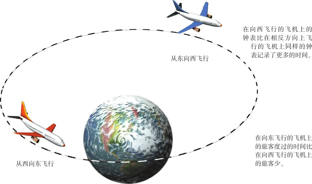 图1.4 围绕着地球在相反方向上飞行的两台精确的钟表的实验验证了孪生子佯谬的一种版本(参见第10页的图1.5)。当它们重新相遇时,向东飞行的钟表流逝的时间稍微短一些。