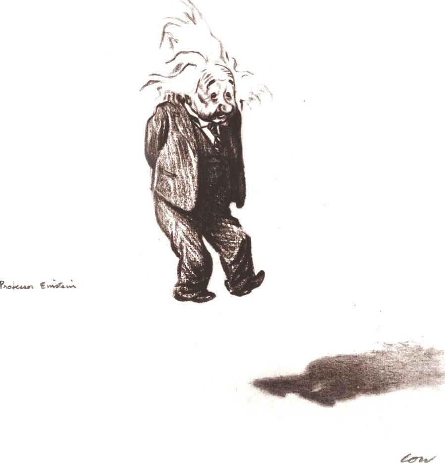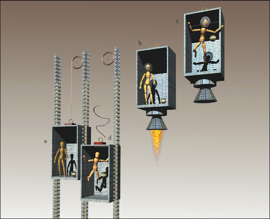 1907年当爱因斯坦还在伯尔尼专利局工作时,他就知道了这个困难,但是直到1911年他在布拉格时才开始认真地思考这个问题。他意识到在加速度和引力场之间存在一个密切的关系。待在一个封闭盒子,譬如升降机中的某人不能将盒子静止地处于地球引力场中和盒子在自由空间中被火箭加速这两种情形区别开来(当然,爱因斯坦处于《星际航行》时代之前,只能想到升降机中而不是航天飞船中的人)。但是人们在升降机中加速或者自由下落不远就会发生灾难(图1.9)。