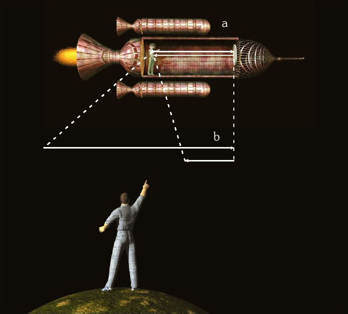 这已经被很多实验证实,其中包括两台以相反方向围绕世界飞行的精确的钟表回返后显示时间的非常微小的差异(图1.4)。这似乎暗示,人们若要活得更长久,应该不断地向东飞去,使得地球的旋转叠加上飞机的速度。然而,人们所获取的比一秒还短得多的生命延长,远远不及劣质飞机餐对健康的损害。