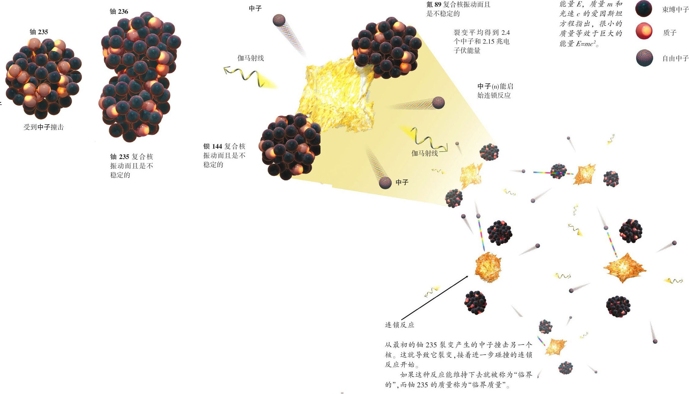 相对论的一个非常重要的推论是质量和能量的关系。爱因斯坦关于光速对于任何人而言都显得相同的假设意味着,没有东西可以运动得比光还快。当人们用能量加速任何物体,无论是粒子或者航天飞船,实际上发生的是,它的质量增加,使得对它进一步加速更加困难。因为要把一个粒子加速到光速要消耗无限大能量,所以是不可能的。正如爱因斯坦的著名公式E=mc 2 总结的(图1.7),质量和能量是等效的。这也许是物理学中唯一的妇孺皆知的公式。它的一项后果是意识到,如果铀原子核裂变成总质量稍小的两个核,就会释放出巨大的能量(图1.8,见14页)。