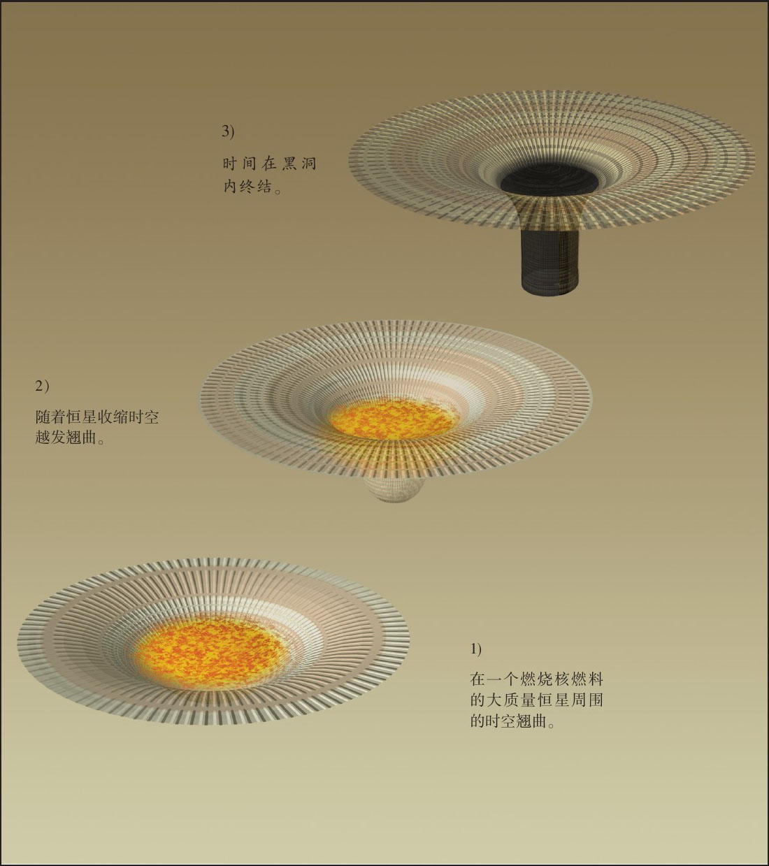 爱因斯坦甚至更不愿意承认广义相对论的预言,即当一个大质量恒量到达其生命的终点,而且不能产生足够的热去平衡其自身使它收缩的引力时,时间将会到达尽头。爱因斯坦认为,这样的恒星将会在某一终态安定下来。但是我们现在知道,对于比太阳质量两倍还大的恒星并不存在终态的构型。这类恒星将会继续收缩直至它们变成黑洞。黑洞是时空中如此弯曲的一个区域,甚至连光线都无法从那里逃逸出来(图1.15)。