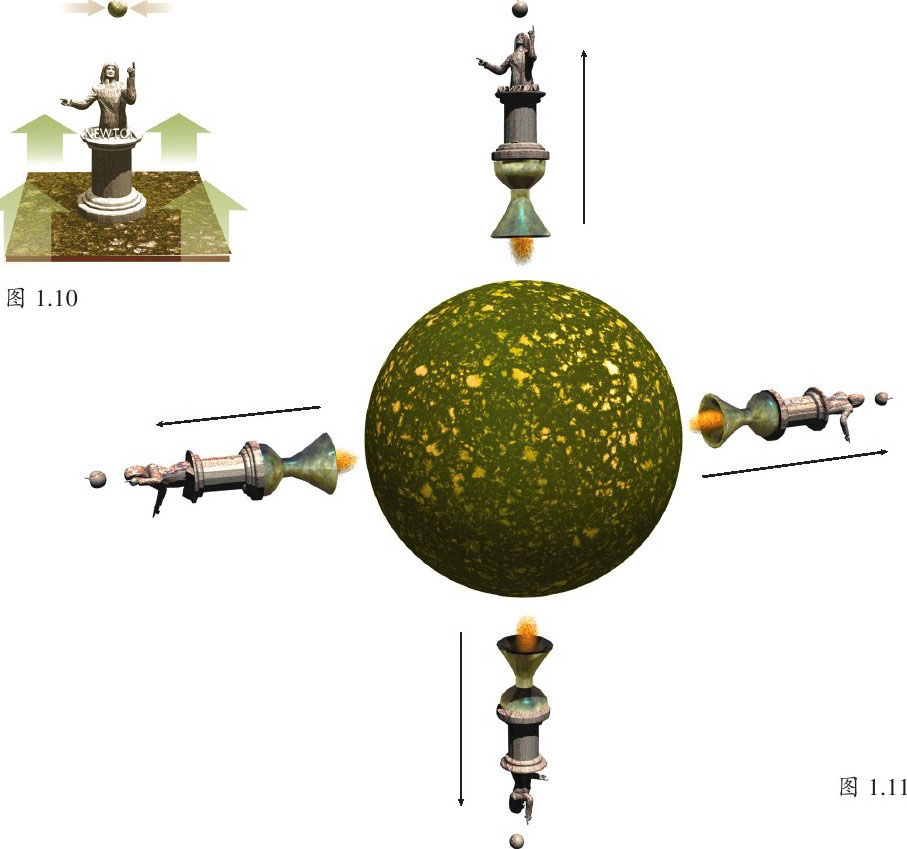 如果地球是平坦的,人们既可以说苹果因为引力而落到牛顿头上,也可以等效地说因为牛顿和地面被往上加速(图1.10)。然而,对于球形地球加速度和引力之间的等效似乎不成立,世界相反两边的人们必须在相反的方向上被加速,却又停留在固定的相互距离上(图1.11)。