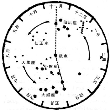 如图 1-2 所示,这是在北方看见的恒显圈内的主要星座。若想看到某月夜晚 8 时左右的星座,我们只需将那月转到顶上来。寻找北极星的方法在图 1-2 中也有所标注,即大熊星座 7 颗星中的 2 颗“指极星”延长线所指的方向便是北极。