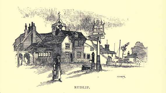 从索撒尔车站出发,这可能会使出行者突然想到它根本不是什么可取的地点,我们走的是平坦的公路中最平坦的一条路——牛津路——就在此地,然后离开运河以及它那可恶的驳船,同时也离开了人造黄油工厂、巨大的贮气罐、以及其它有用但却讨人嫌的哨站和文明必需品。沿着极好路面的公路加速前进,经过海斯恩德,小村庄的伦敦佬很高兴地叫着“易灵顿·易思”(即希灵顿·希思),直到经过约二公里半到阿克斯布里奇,在此要注意右边有个拐弯处很适宜地装了一个指示牌,指向伊肯纳姆、鲁斯利普和平纳。我们从这里离开尘土飞扬的公路以及开着克拉曼汽车匆忙而过的家伙,由于他们高速驾车,他们的脸上一点都显示不出愉快的表情。我们现在进入一条安静的小路,这是一条令人愉快的约一公里半长的下坡路,经过希灵顿考特一棵树枝伸过路面的巨大古树,向伊肯纳姆进发。那是一个极为安全和极为令人愉悦的海岸,远离人群,沿着一条小径,其两旁枝繁叶茂的美景和郁郁葱葱的树篱很可能属于德文郡,而不只是处于米德尔塞克斯郡。在伊肯纳姆,有一个特别小的、奇异的古色古香的村子非常矛盾地只能在这个人口最多的英国郡县找到,那是一个有一块绿草地、一个池塘、一个水泵的村子。这个池塘也许没有它应有的那么透亮,这是因为有群鸭子经常起劲地激起烂泥;而这块草坪大多是些松散的沙砾,也没有期望的那么多绿草;但是这个水泵却占据着正中的位置,即装饰华丽又有实用价值,其外表有点介于中国的寺院、郡议会的露天音乐台、和报刊亭之间。同时,在它的风信标上为了某个忠实的庆典或别的什么事情,仍然保留了破烂发暗的旗子,这可能意味着忠于主颂,也可能仅仅是当地人的懒惰。那非常有趣的古教堂用石灰水粉刷了墙面,奇怪的屋顶窗有一些很妙的窗户,小小的木制尖塔显露出白色,与稠密的树木的背景形成了映衬,它们合在一起正是格雷在他的《墓园挽歌》中所描述的地方,墓地里躺着的是小村庄的心智未开的祖先。郊区的居民还没有扰乱这一“古老的宁静之家,”它仍然值得艺术家极为认真的关注,就如壮丽而古老的詹姆士一世时期的斯瓦克利斯宅第一样,直立在附近的公园里。
