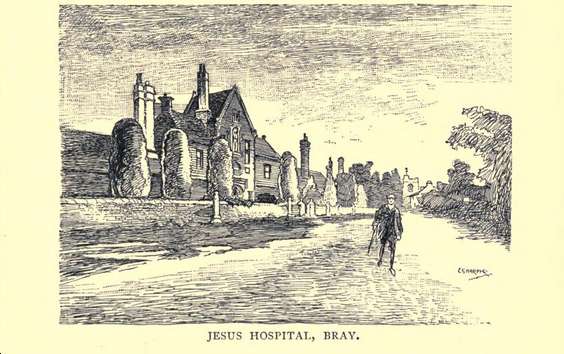 教堂墓地的入口是一个停柩门,其上是间稀奇的旧房子。教堂本身的里面有座威廉·戈达德的纪念碑,他是十七世纪耶稣医院的创立者,而乔伊斯是他的妻子。我们离开布雷前往温莎时,看到路旁直立着一座著名的古救济院,那是一幢有山形墙的古色古香的红砖建筑,在入口处的壁龛里有一位创立者的雕像,中央庭院很少有住宅围绕着它,一间非常引人注目的小教堂,在弗雷德里克·沃克的著名画作里人人皆知,《庇护港》于1871-72年画于此地。不幸的是,那些熟知这幅漂亮画作(现藏于国家美术馆)的人在看到真实的绘画地之后将会非常失望,因为画家把耶稣医院非常理想化了,因此想像了很多并不存在的细节。