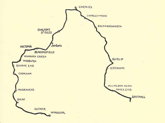 离开切尼斯,重新回到公路前往阿默舍姆,我们骑车而行,在查尔方特路火车站从大都会铁路线下穿过,再转一个弯向左,前往查尔方特的圣·贾尔斯。从纯粹的村民观点来看,这五公里形成了整个行程最精美的部分;因为他们要通过一片香气四溢的林地,此处松树的香味和欧洲蕨的浓浓的香气(很像成熟的草莓的浓香)与新鲜的泥土气息混合在了一起。白天,除了野鸡嘶哑的“咕咕”声,没什么会打破这里的宁静,而夜晚降临的时候,身着羽毛饰品的教堂唱诗班从非常有名的邻村“夜莺丛林”传来曲子。