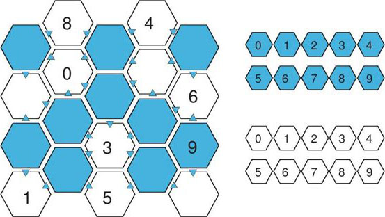 一名设计师从蜂窝的构造中得到灵感,创作了这道逻辑题。题目要求将整数0~9填入网格,使这10个数字分别出现在蓝色六边形和白色六边形中。具体规则如下: