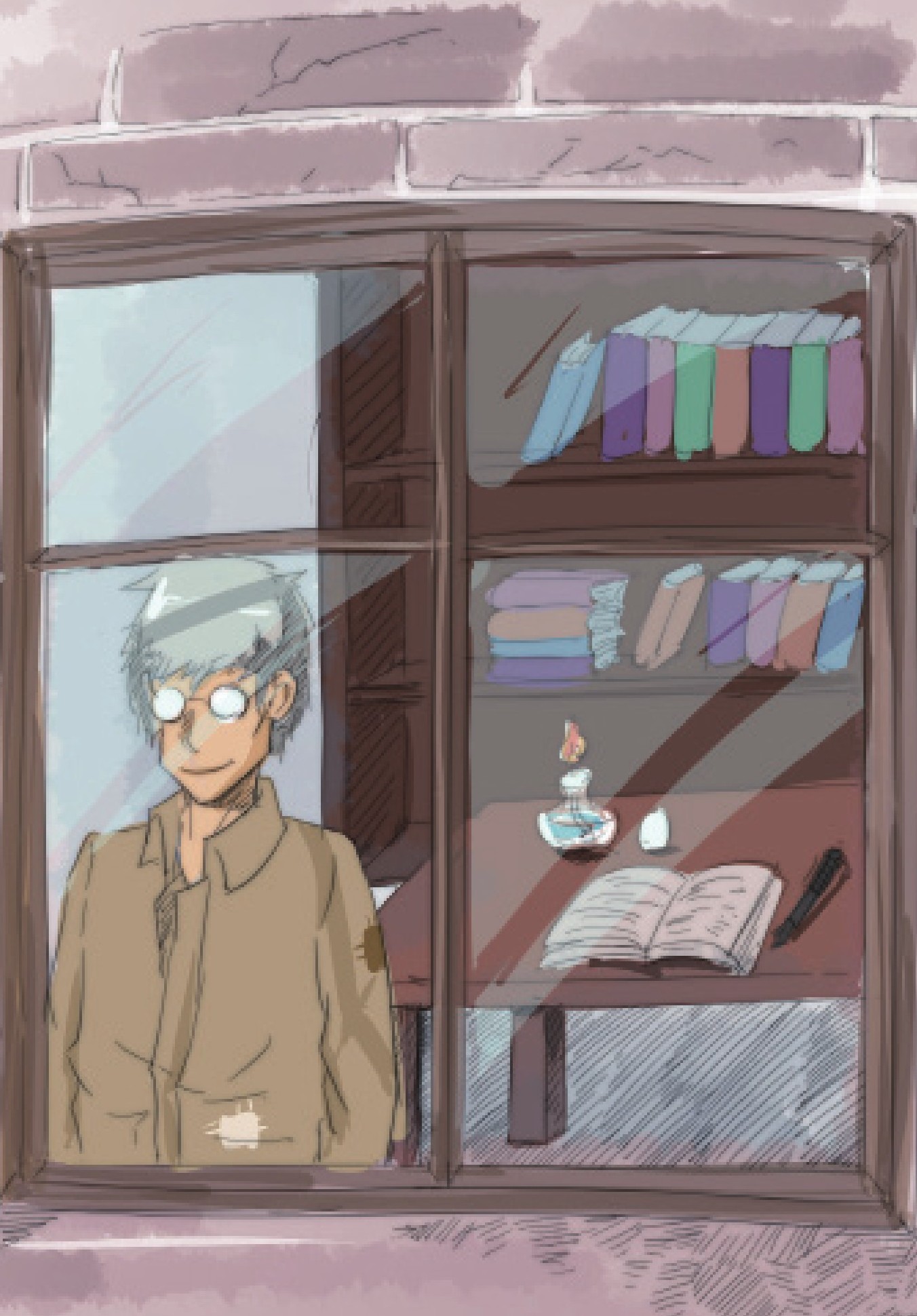 有时候,他会呆呆地站在窗户前或者是屋子的任何一个地方,长时间地不动,闭着眼睛抬着头,好像一根木头一样。我爬到房顶上,隔着院子从窗户观察他。