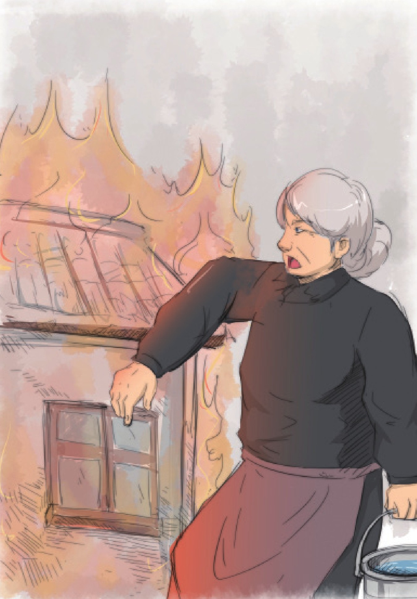 外婆的表现就像这场大火本身一样令人惊讶。大火映照着她的黑衣服,无论走到哪里,都把她照得亮亮的。她跑来跑去,指挥着所有人。