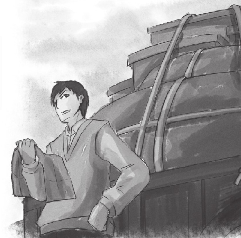 我哭了一会儿,想到现在悲伤也于事无补,我决定先上大船去。当时,天气炎热,我脱掉衣服,跳下水去。可是,当我游到船边时,却没办法上去,因为船已搁浅,离水面很高。我绕船游了两圈,忽然发现一根很短的绳子,那绳子从船头上挂下来,绳头接近水面。我抓住绳子往上攀登,进入了船的前舱。