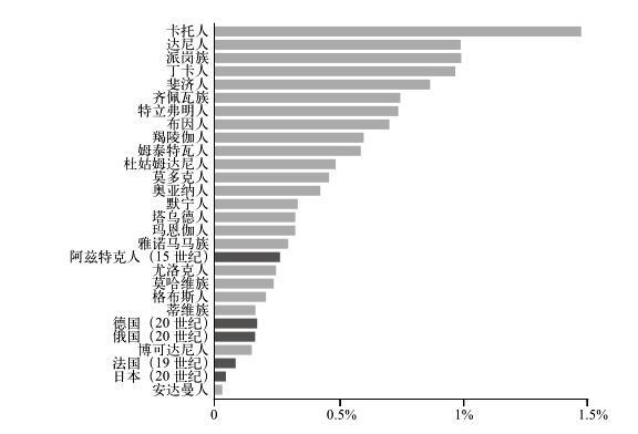 图2-2 战争死亡率比较。原始部落和现代国家每年战争而死亡人数占人口百分比