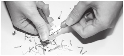 一边旋转铅笔一边向前削,要均匀地削去木头。