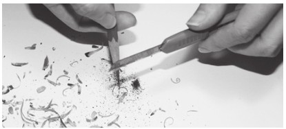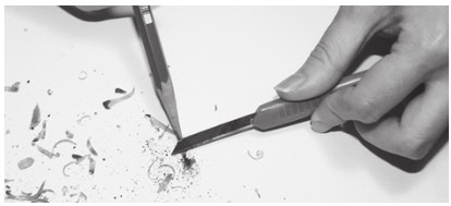 传统的裁纸和削铅笔工具。其实削铅笔也是画素描的一部分。使用美工刀能将铅笔削出又长又尖的形状,更适合在素描绘画中排线使用。正确削铅笔的方法请参考左页图。