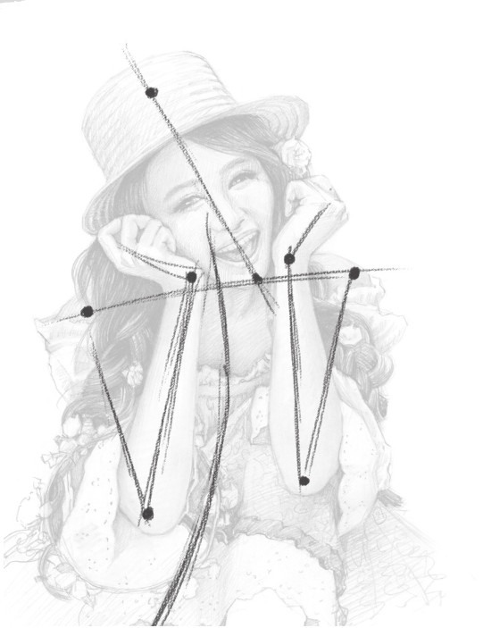 将肩膀、肘关节、脖子、头顶这些明显的关键点作为结构点,在大动态线上先找到这些点,以它们为标准相互比较着画,就可以画出动态准确的人物了。