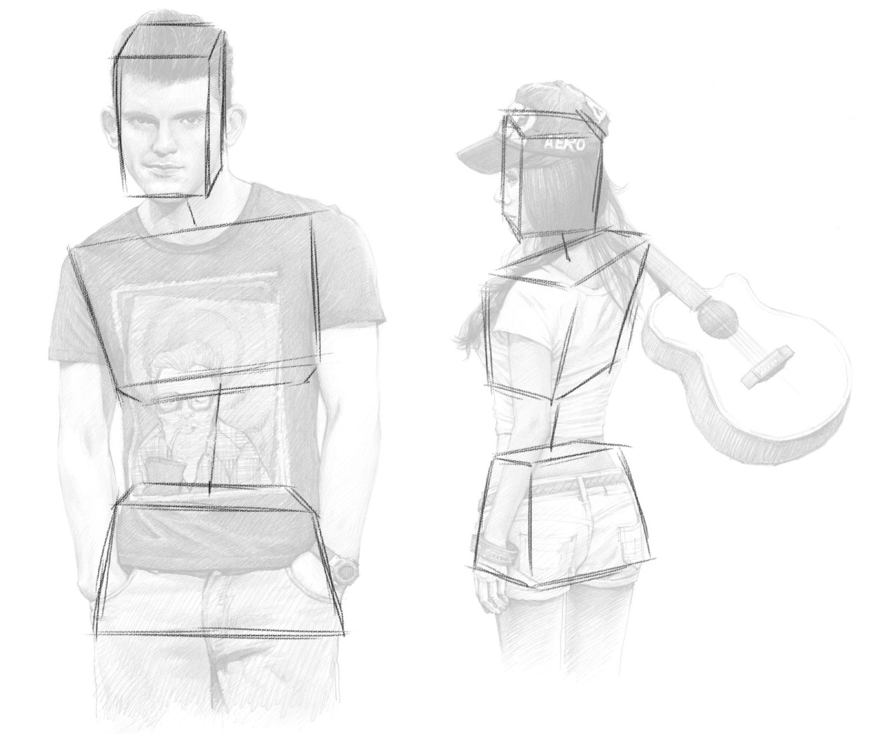 将人体分解成一些简单的方块,再根据立方体的透视原理来分析和判断人体各部分在空间的透视变化。