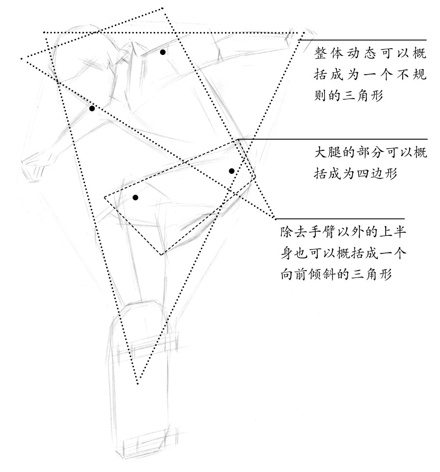 将身体的轮廓用直线和一些简单的几何形概括出来,通过线与一些几何形相互比较,找到一些关键的结构点(如肩膀、盆骨、膝盖等),从而找到最准确的动态。