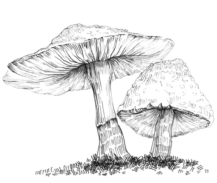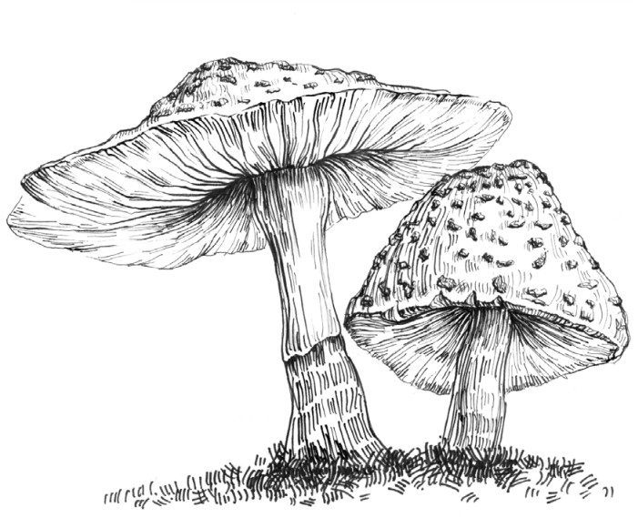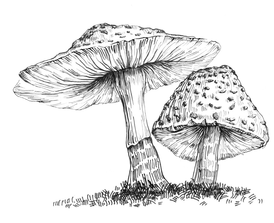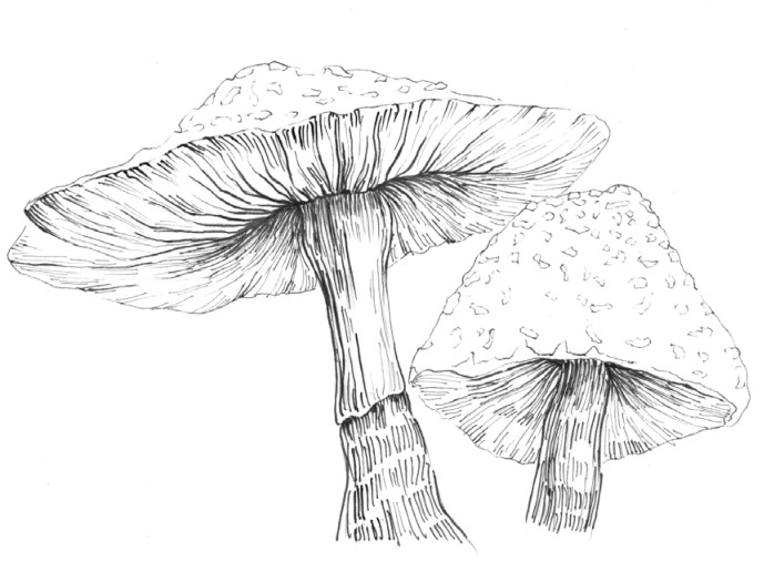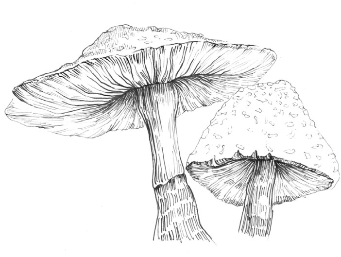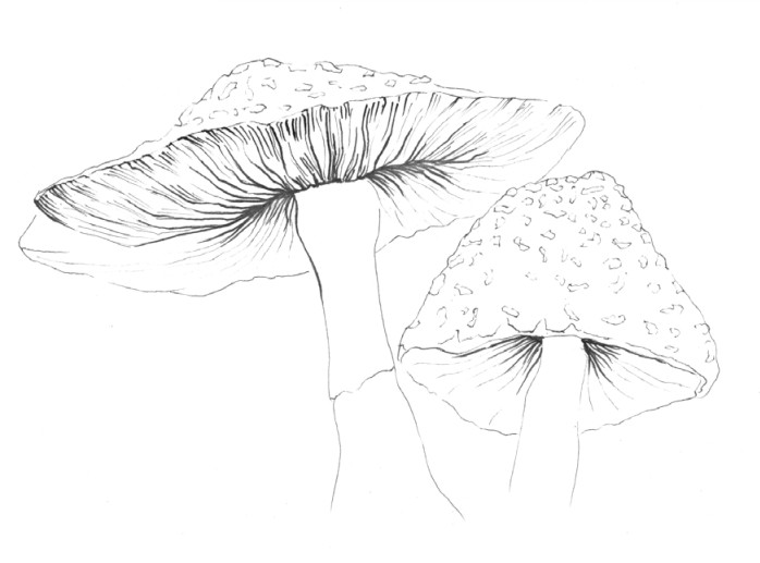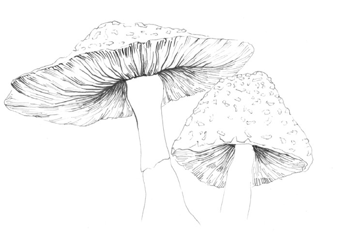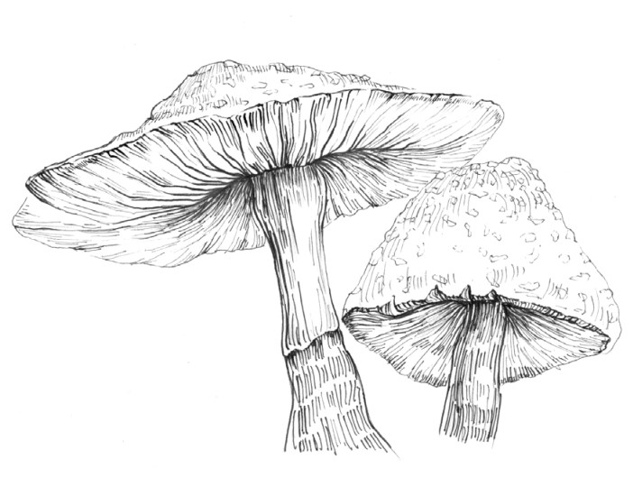 用针管笔把线稿画出来,注意菌盖前后的虚实变化。
