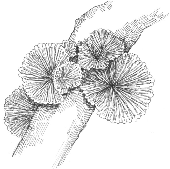 1 裂褶菌的外形像一朵圆形的花,与其他蘑菇不一样。