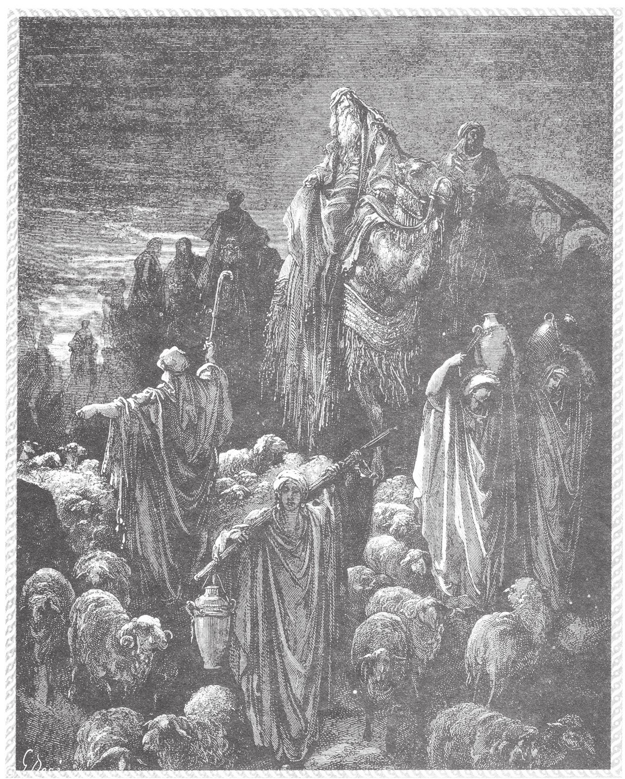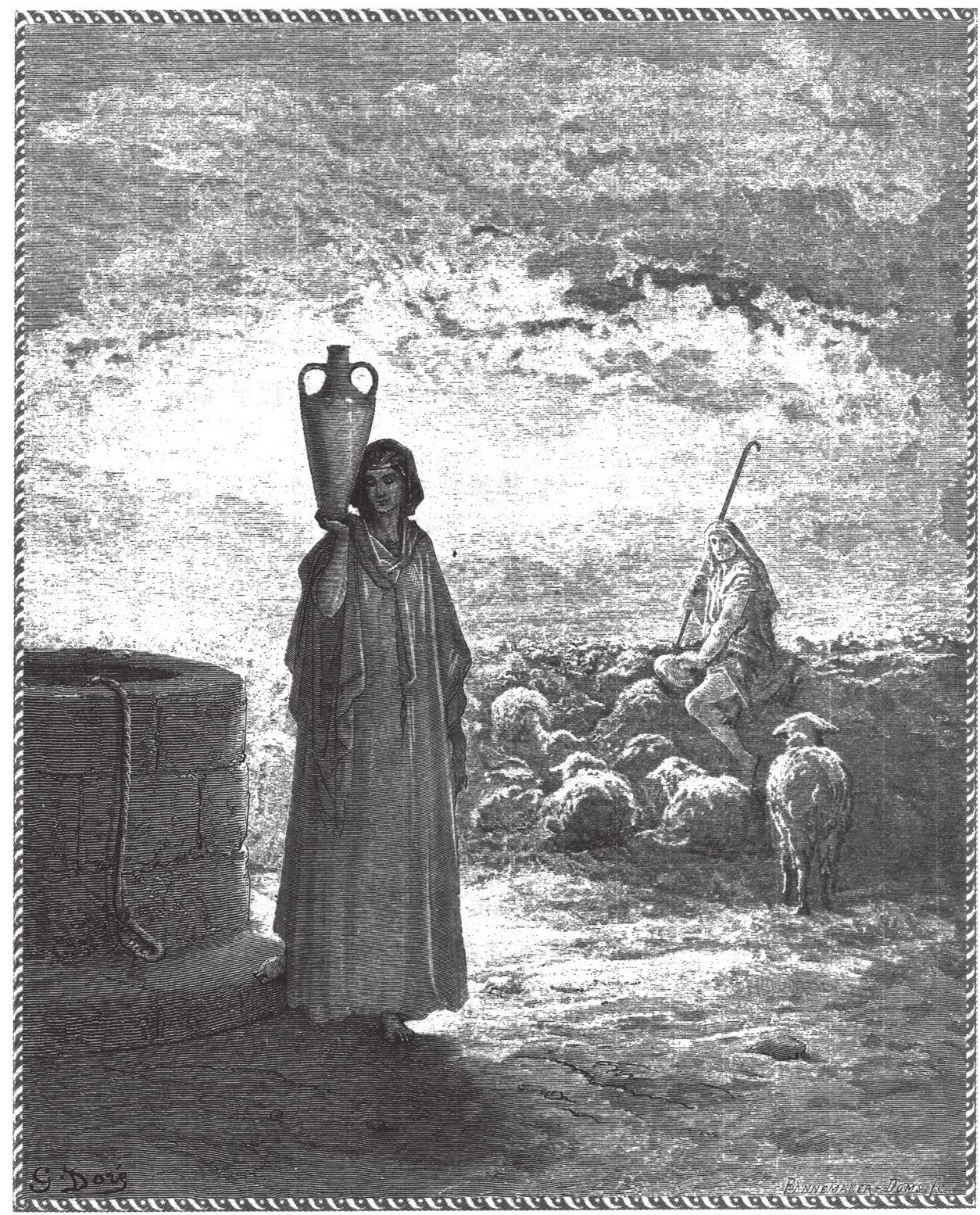 雅各傍晚时分到了哈兰城外。城门外的田野中有一口井,许多哈兰人聚在井边等着饮羊。他们或坐或站,或靠或依,三五成群地在谈天说地,还有一位青年坐在石阶上吹长笛,笛声绵长悠扬,与大漠西下的斜阳相映成趣。