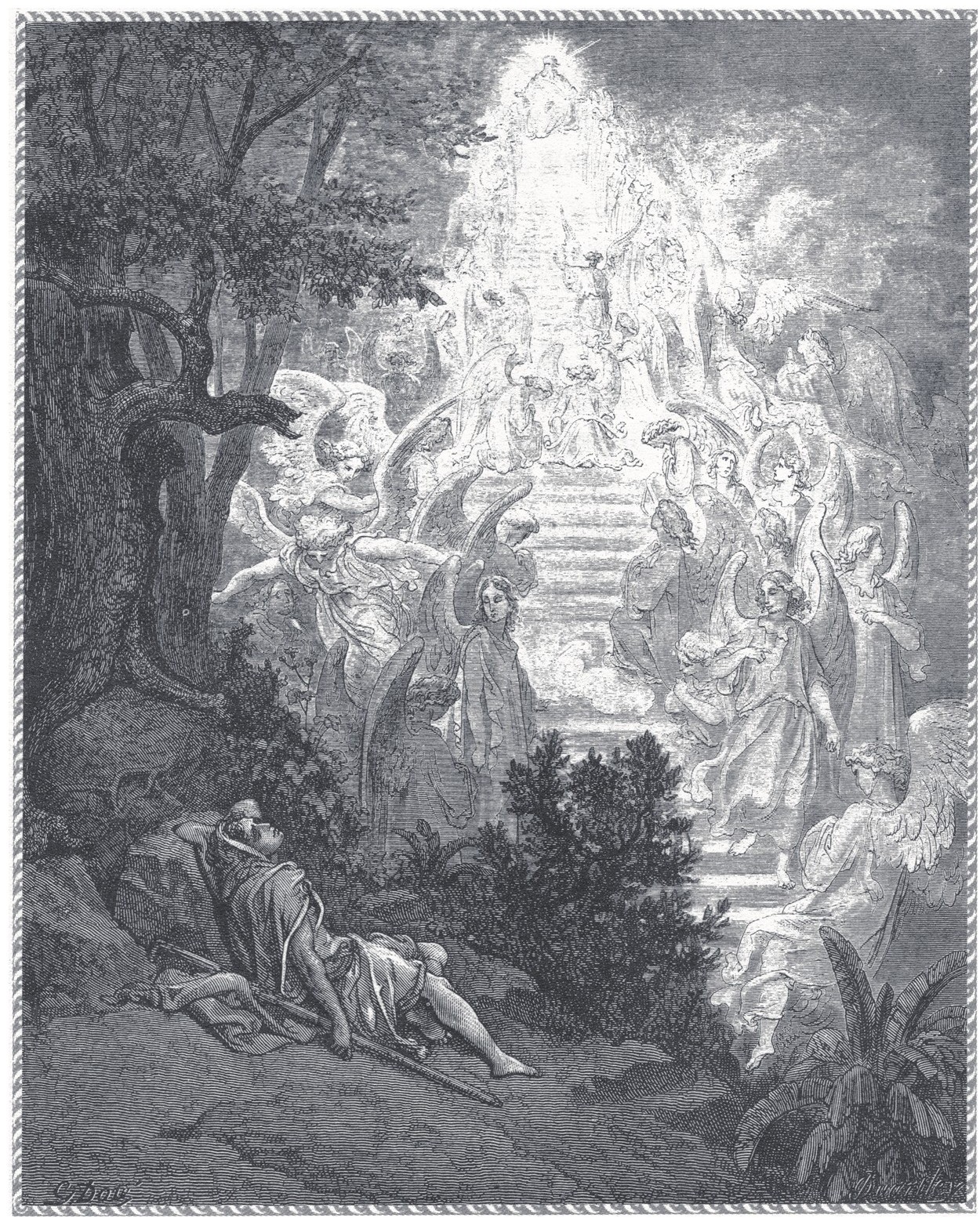 一天晚上,在一整天的跋涉后,雅各打算找地方休息。他捡了一块石头当枕头,躺下一会儿就睡着了。雅各梦见一个梯子立在地上,梯子的头顶着天,上面有上帝的使者上上下下。最后,上帝出来,站在梯子的顶端,说:“我是上帝——你祖父亚伯拉罕的神,也是以撒的神。我要将你现在躺卧之地赐给你和你的后裔。你的后裔必像地上的尘沙那样多,向四面八方扩展。地上万族必因你和你的后裔得福。我也将与你同在,保佑你,引领你,总不离弃你。”