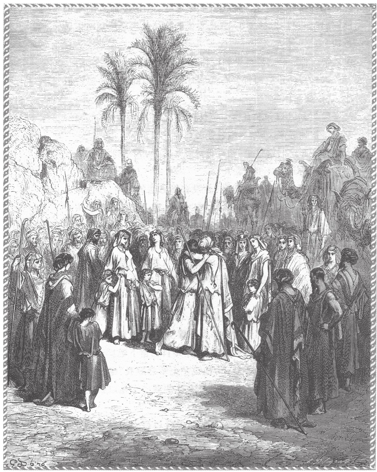 说完这些,约瑟再也忍不住,与便雅悯拥抱在一切,两兄弟放声痛哭。接着约瑟又与其他兄弟拥抱亲吻,众兄弟交谈起来。