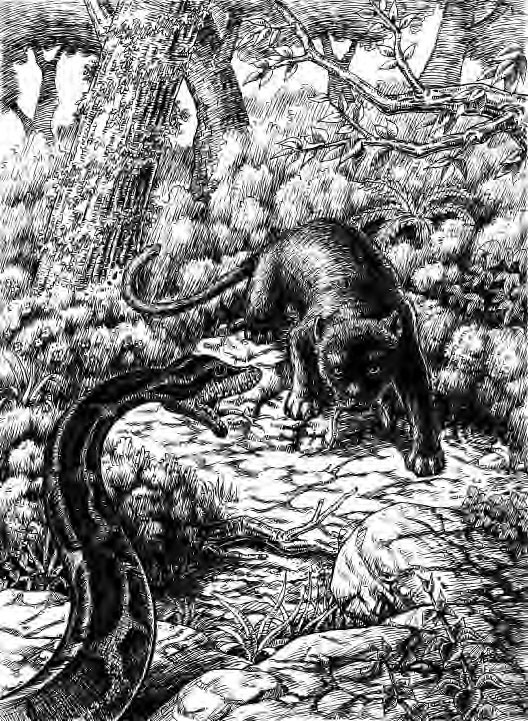 蟒蛇宝宝半个身体刚刚爬出石洞,阿黑突然往前一个蹿跃,就像一股黑色旋风,刹那间来到石洞口,阿呜一口就把蟒蛇宝宝咬进嘴去,连骨头都不用吐,嚼了几口便咽进肚去。动作娴熟,手脚麻利,看得出来,它已经不是第一次做这样的事了,吃蟒蛇宝宝已经吃得熟能生巧了。在吞咽蟒蛇宝宝过程中,它微闭着眼,很陶醉的样子,就像在享用一道特别精美的小点心。吃完后,它还伸出灵巧的舌头舔理唇吻,将粘在胡须和嘴角边的血丝肉屑也舔干净了。太好吃了,一点也舍不得浪费。