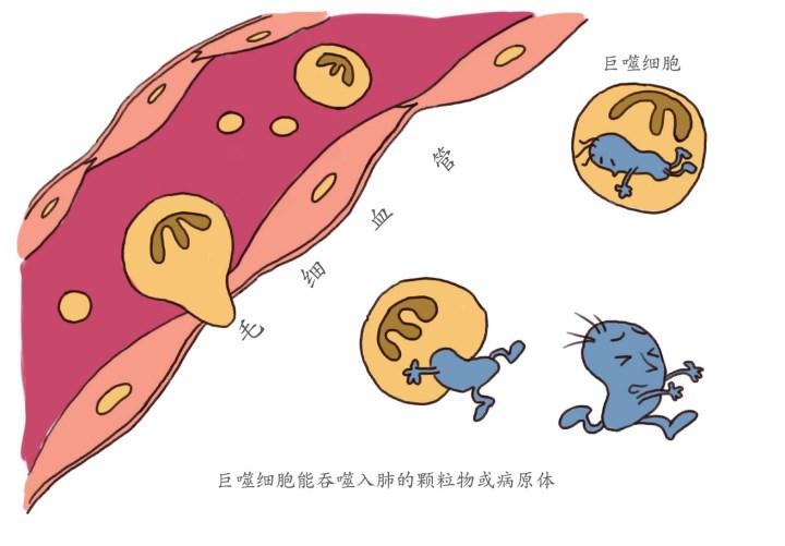 空气中有很多粉尘、漂浮物以及PM2.5等可吸入颗粒物,PM2.5会直接进入肺泡细胞并永远留在那里,进而引起肺部病变,而其他大于10微米的可吸入颗粒物,被吸入体内后不会主动进入肺泡,可能会被人体以咳痰等方式排出去,然而排不出去的有害细菌、微生物也会被肺泡里的巨噬细胞(属于一种大吞噬细胞,也是一种免疫细胞)吞噬,进入肺泡和细胞内部。