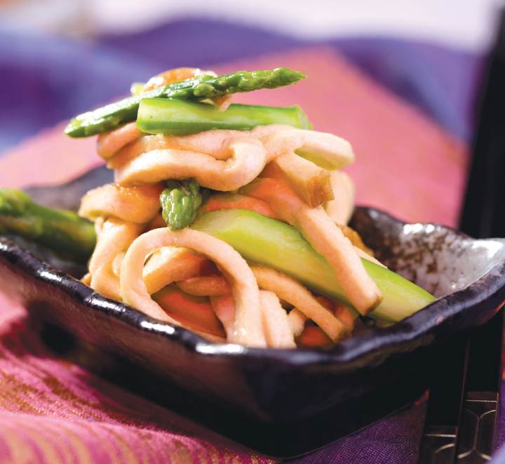 很喜欢的一道菜,但建议豆腐干不要放油锅内冲炸,可以把豆腐干放油锅内,用中火煸炒两分钟至干香,再加入芦笋、调料等快速炒匀即可。