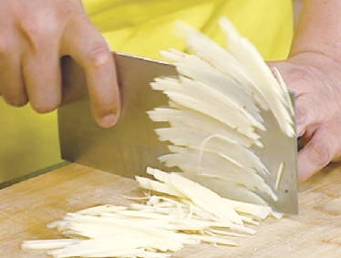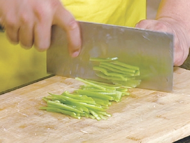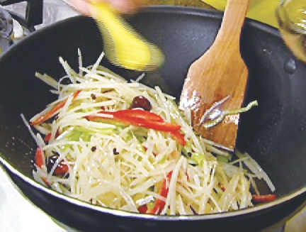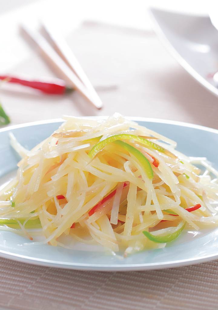 名厨笔记 青椒土豆丝制作上需要注意以下三点:一是土豆丝尽量用刀切,要切得粗细均匀,以保证同步成熟;如果切不均匀,可以用礤丝器;二是土豆丝想要吃脆口的就一定要泡水,这样能减少淀粉,土豆丝也清爽,而且色泽也会更好;三是放入少许白醋,可使土豆丝保持脆感。
