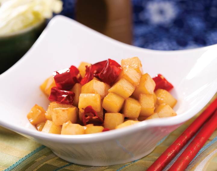 名厨笔记 香辣土豆丁是以土豆为主料,搭配红干椒等炒制而成,具有色泽美观、土豆软糯、香辣味浓的特色。制作上土豆丁也可以先焯烫一下,再放入少量油锅内煎炒上色,再放入红干椒段等炒熟上桌。