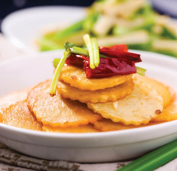 3.锅中留底油烧热,下入红干椒丝、蒜末炒香,放入土豆片,加入精盐、白糖、味精煸炒两分钟,撒上香菜段,淋入花椒油、香油,出锅装盘即可。