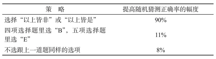 通过计算,我对上述及其他选择题的猜题策略在提高随机猜策正确率的幅度上进行了评估(见表