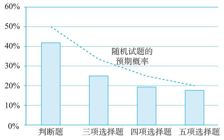 我把这些结果绘成图 2-3 ,虚线表示真正随机试题的预期概率。不管有多少选项,答案的重复次数总是过少。这意味着,考生在猜答案的时候,只要避免选择跟前一题相同的选项,就能轻松获得一定优势了。