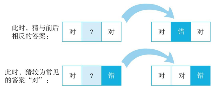 例如,如果你要猜的题夹在你确定知道两道选“对”的题目当中,你最好猜答案为“错”。而如果相邻的两道题,一道答案是“对”,另一道答案是“错”,交替规则会给出矛盾的信号,你应该选择较为常见的答案,也即“对”(见图 2-2 )。