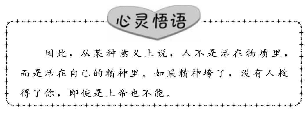 这就是心境的魔力。有时候,一个人的精神可以击败许多厄运。因为,对于人的生命而言,要存活,只要一箪食、一钵水足矣;但要活得精彩,就需要有宽广的心胸、百折不挠的意志和化解痛苦的智慧。