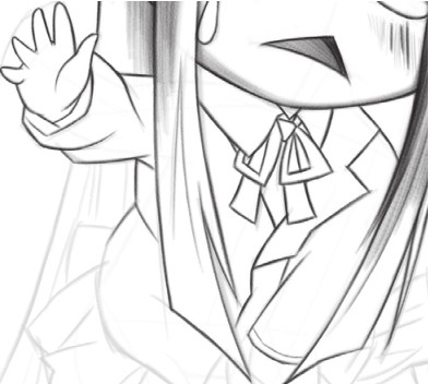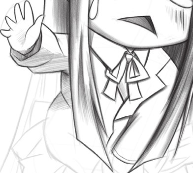 绘制衣服,注意衣领、蝴蝶结的结构要绘制正确,衣服结构的透视变化要有所体现,绘制的线条可以硬朗些。