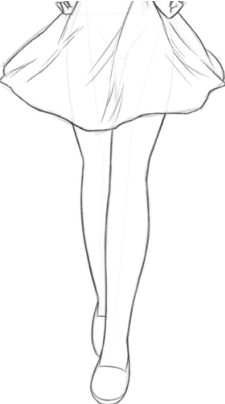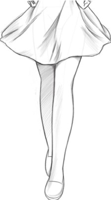 绘制裙子,注意腿部动作对裙子褶皱的影响,如左腿向前迈出,裙子因为腿部动作会形成下垂和拉伸交替的褶皱。
