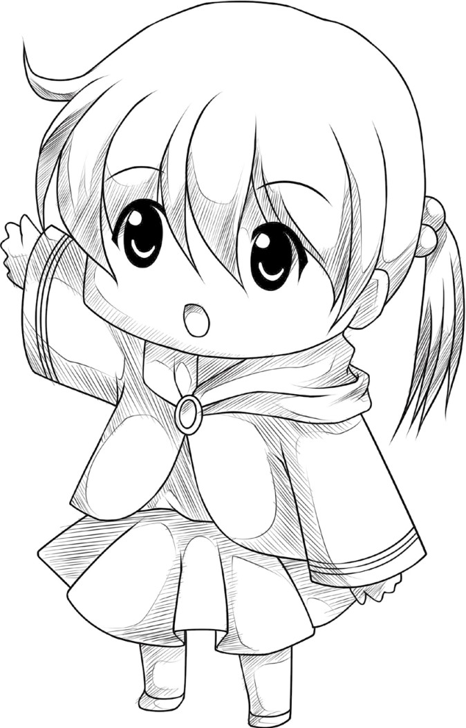 继续刻画草图,添加细节,如每一股头发具体的样式、五官的具体样式、裙子褶皱的具体表现等。